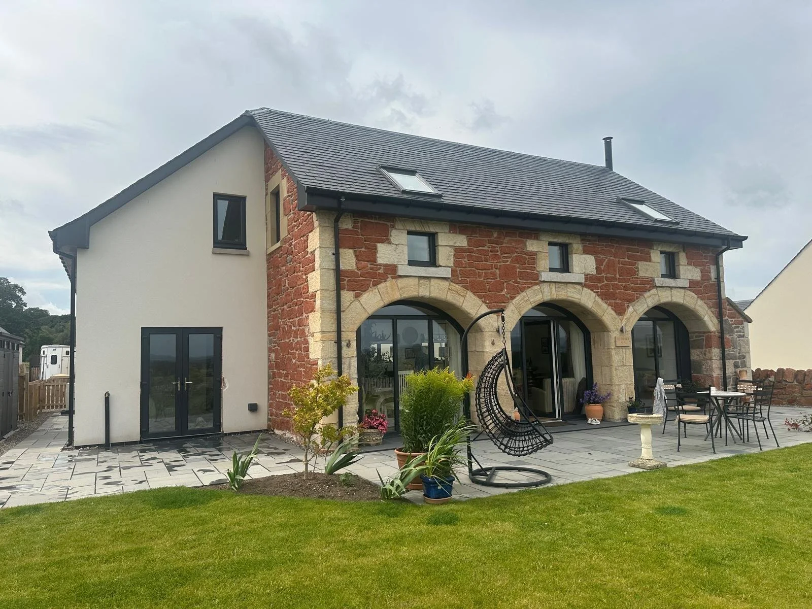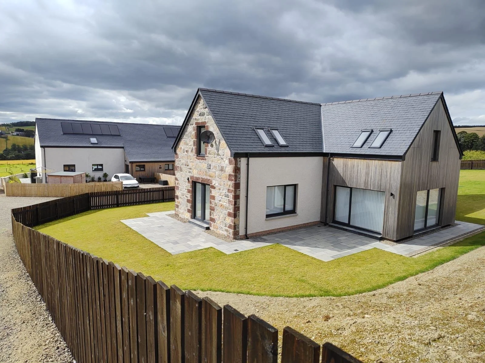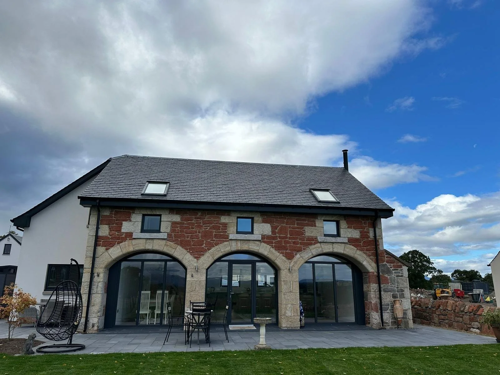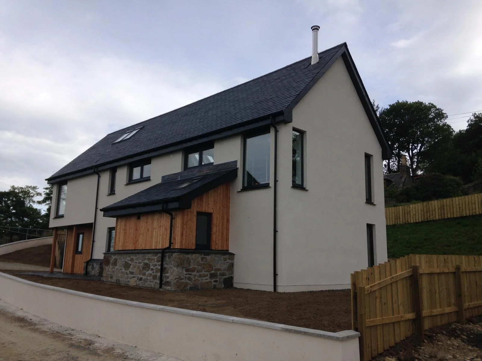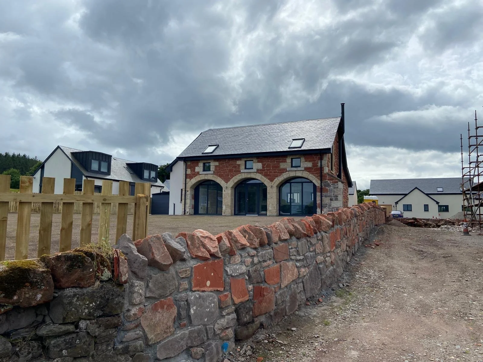 A newly built house with a stone and brick exterior, large arched glass doors, and skylight windows on the roof, under a cloudy sky. A stone wall and a wooden fence are in the foreground, and other houses are visible in the background.