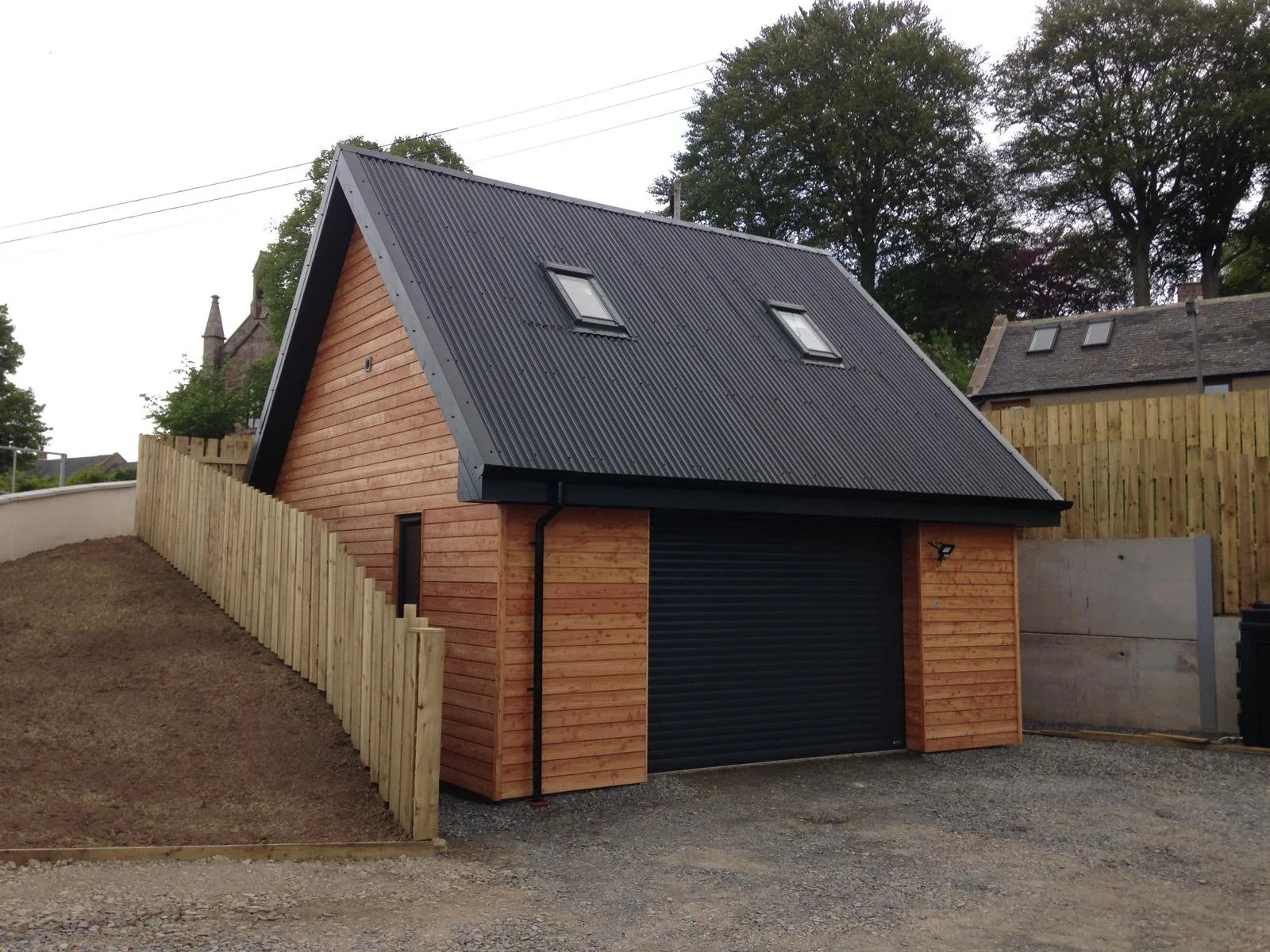 A small garage with a black roll-up door, wooden siding, and a black metal roof with skylights, surrounded by a wooden fence and gravel driveway.