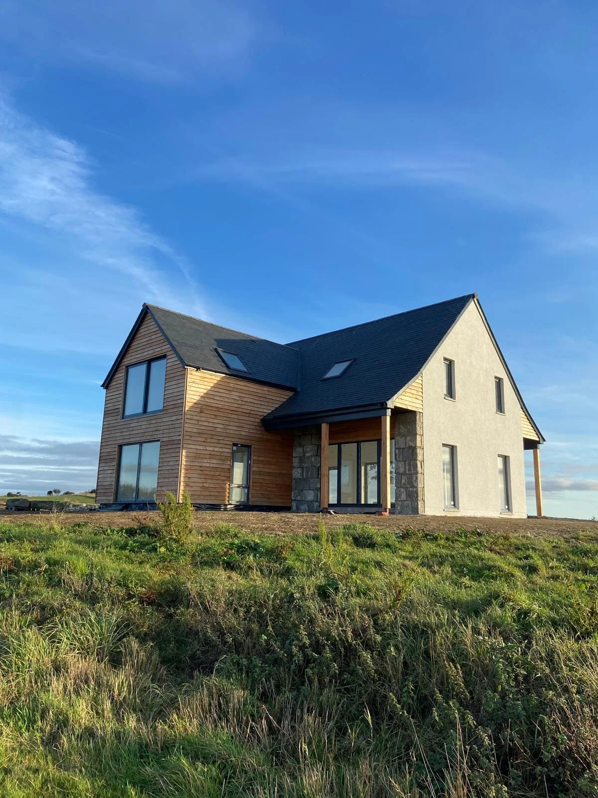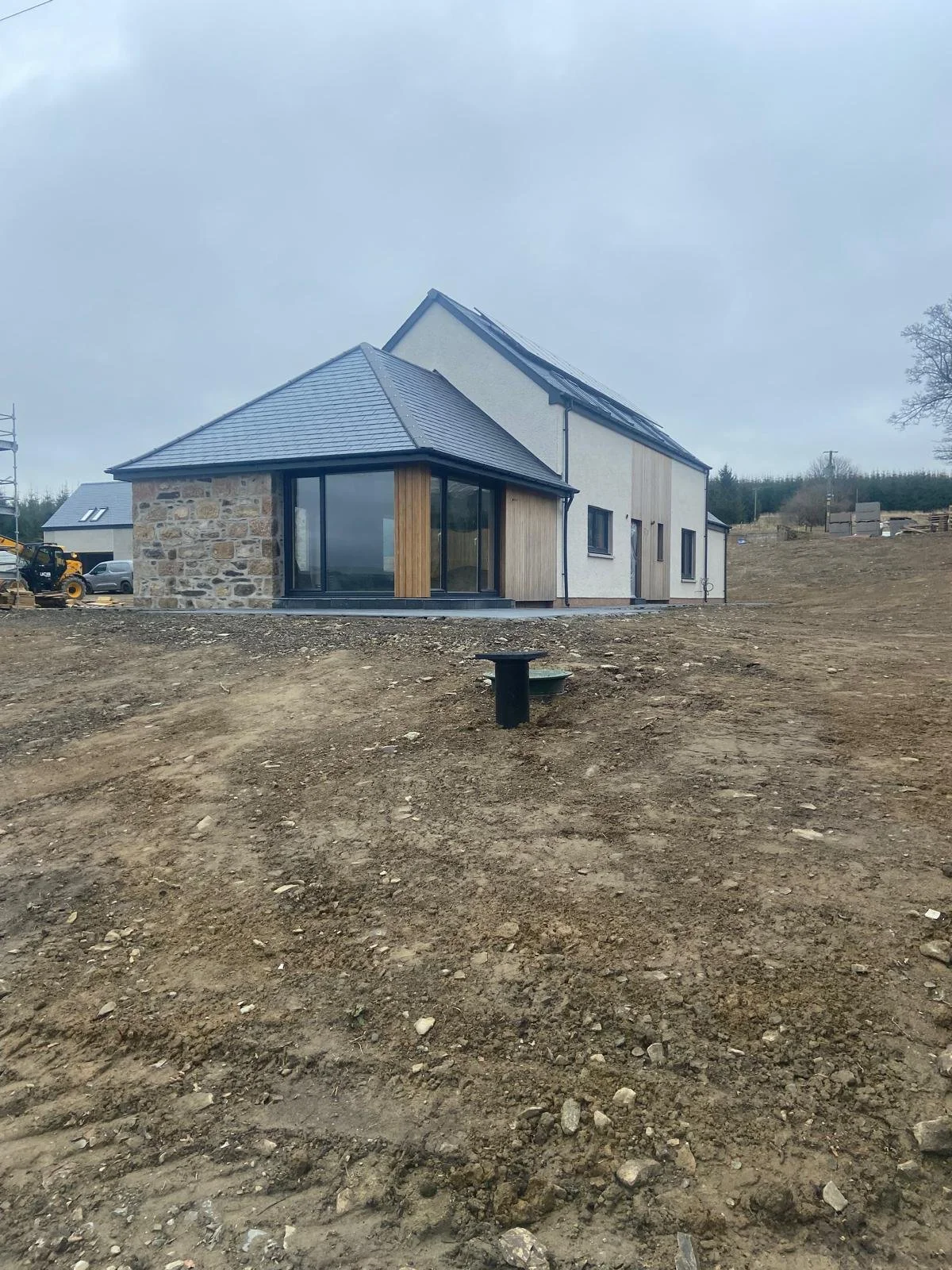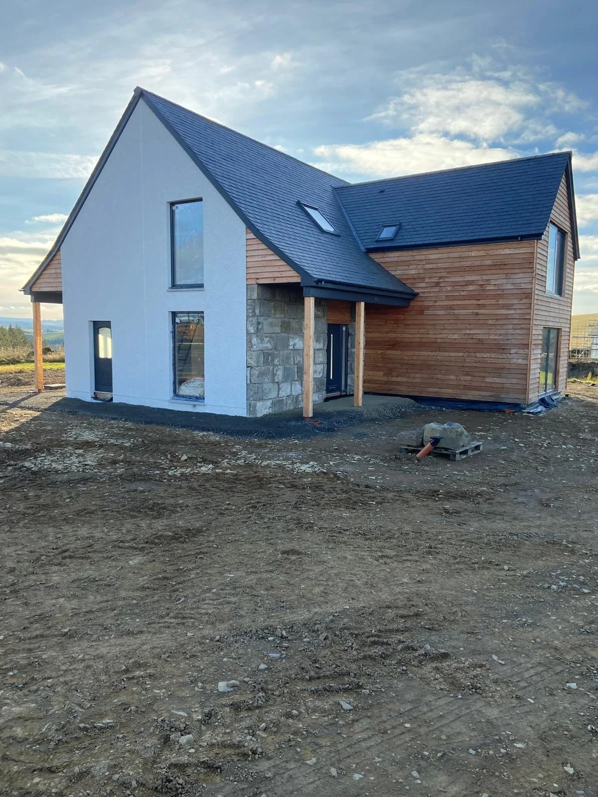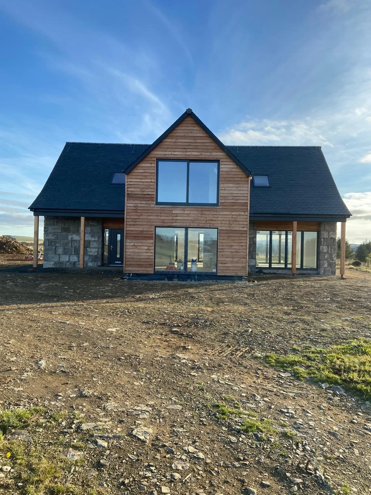 Newly constructed house with a mix of stone, wood, and white exterior walls, large glass windows, and a dark slate roof, situated on a bare dirt lot.