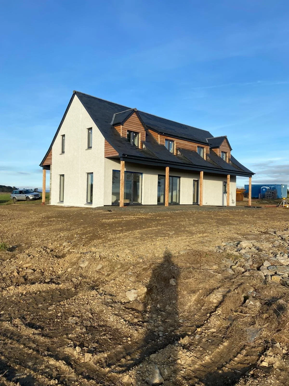 A modern, two-story house under construction with a black roof, white walls, and wooden accents. The house is standing on a dirt plot with a clear blue sky overhead.