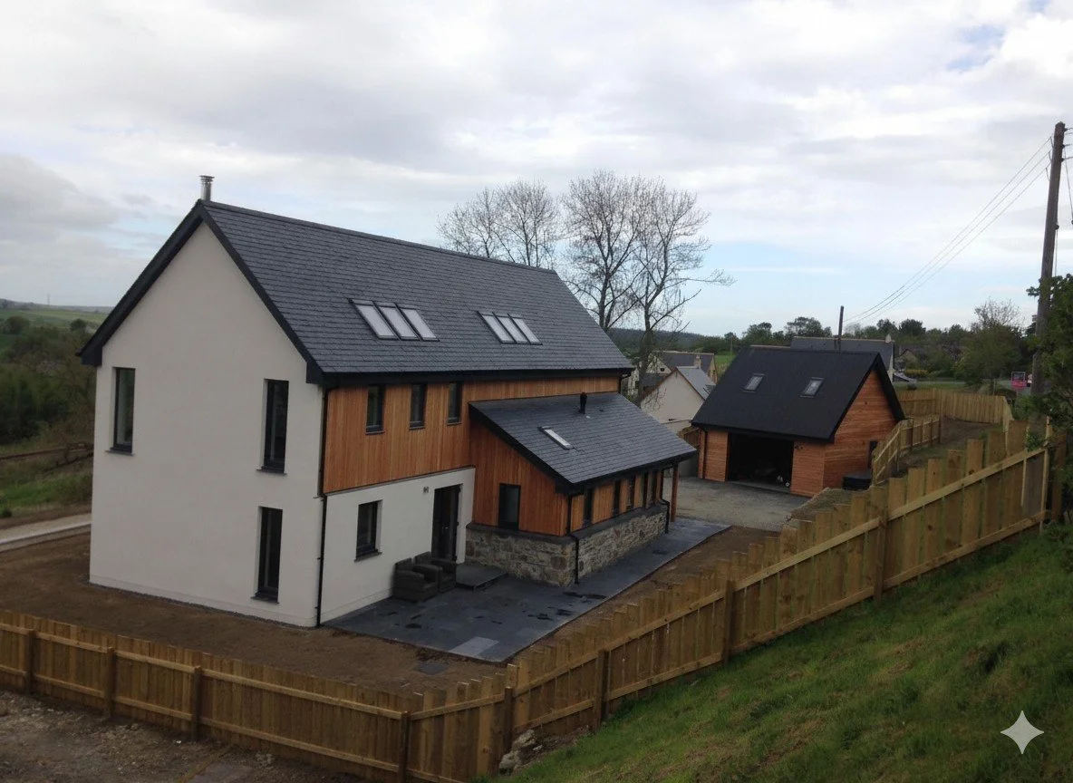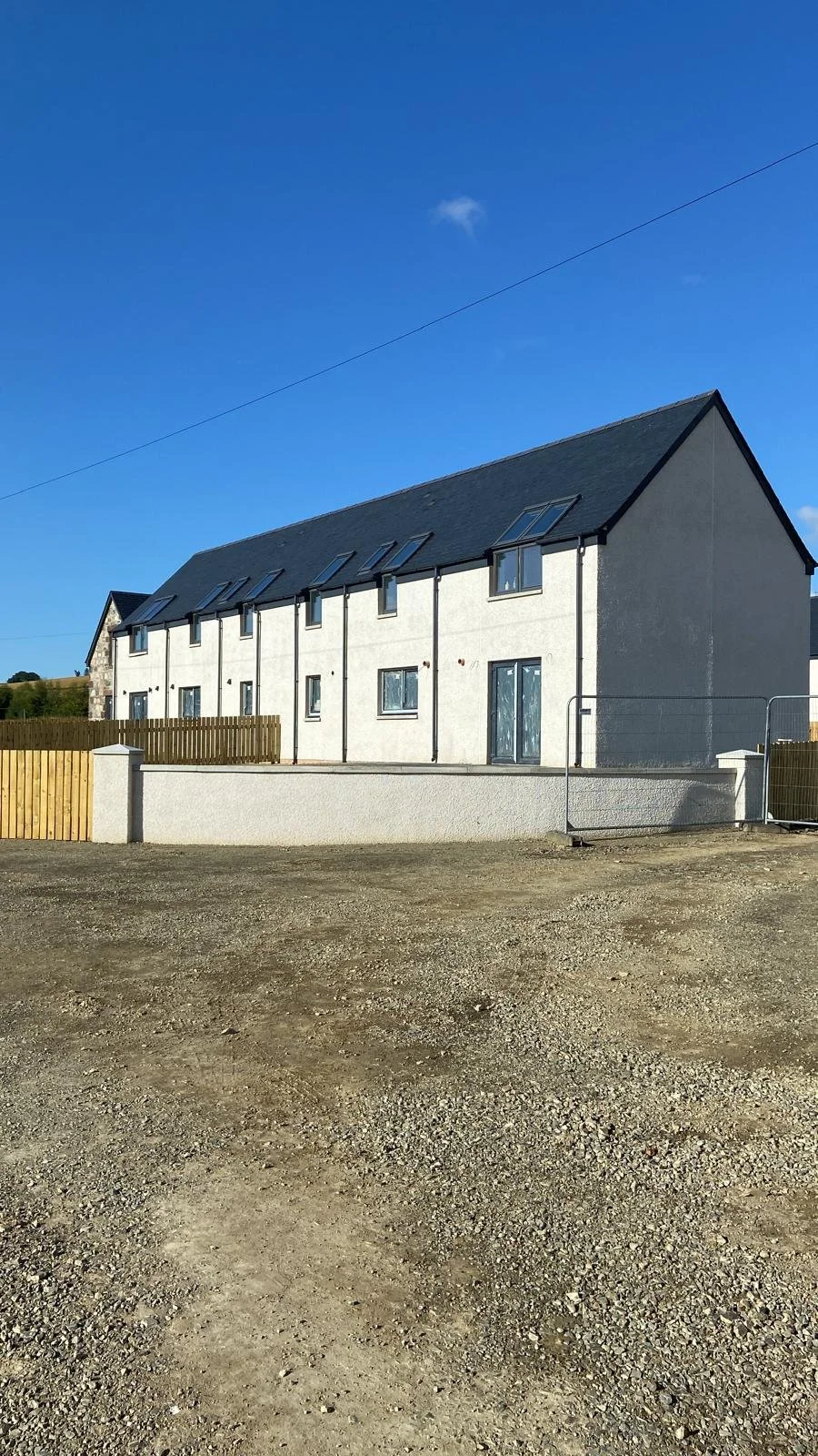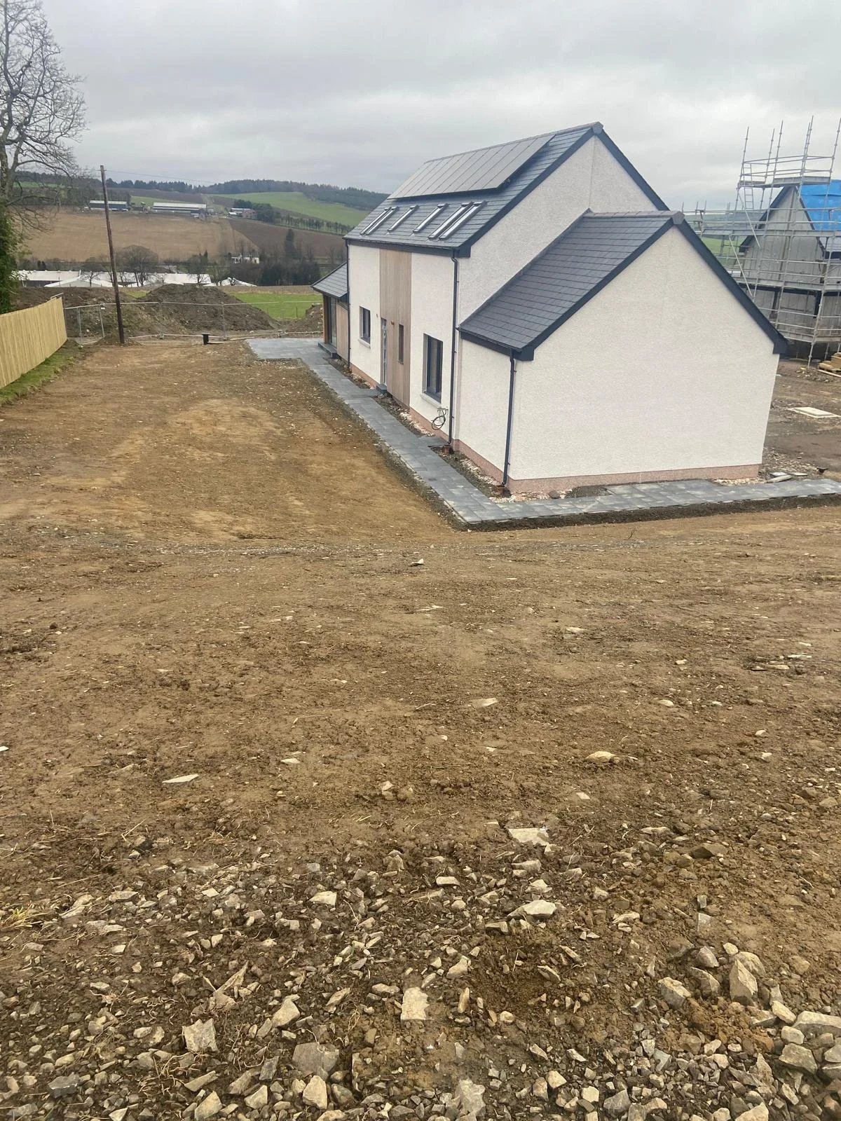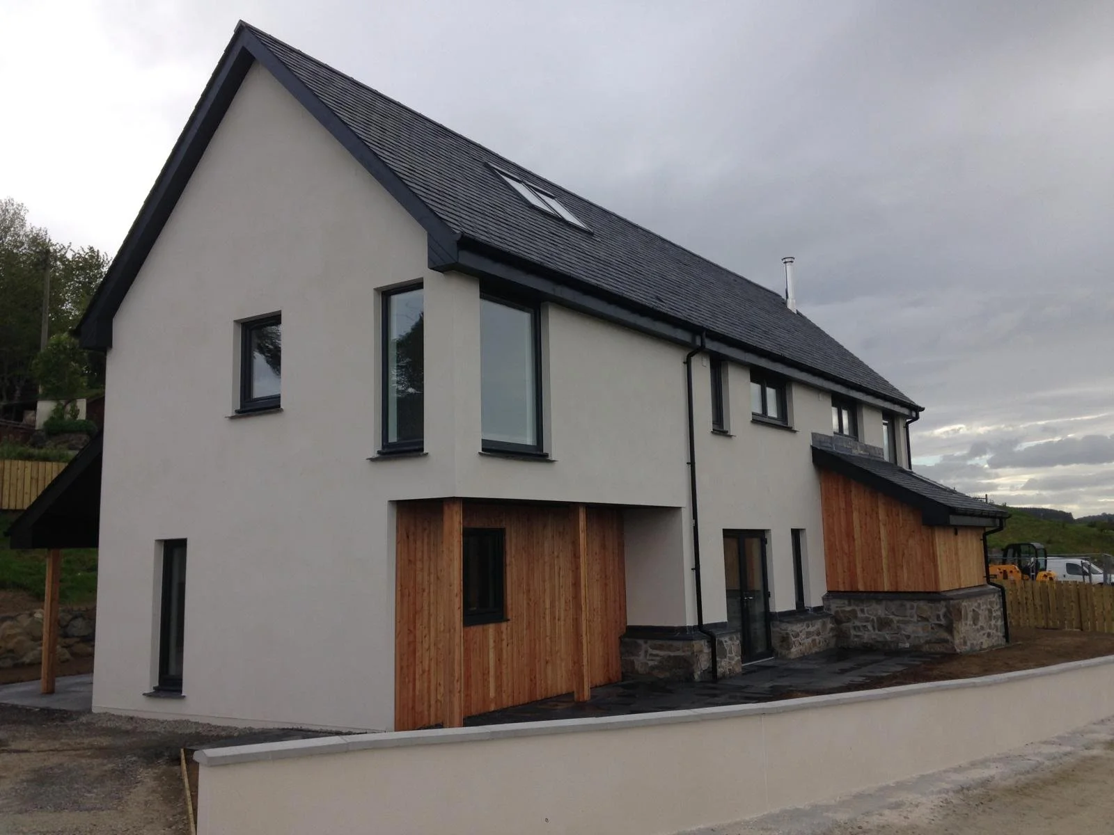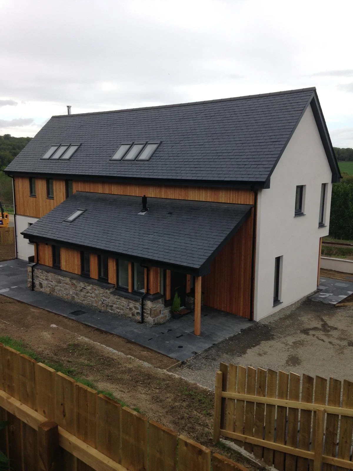 A newly constructed modern house with a dark gray pitched roof, white exterior walls, and wooden accents. It has multiple skylights and a stone foundation at the front entrance, surrounded by a partially paved yard and wooden fencing.