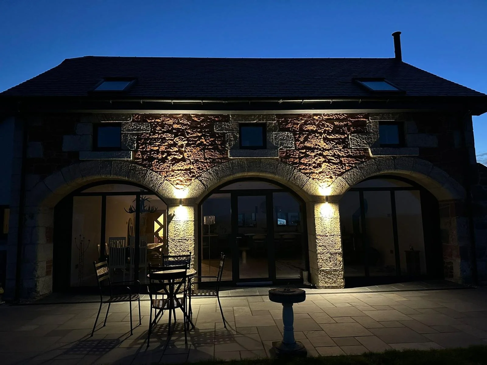 The back of a stone house illuminated by exterior lighting at dusk, with three large arched windows and a sitting area with a table and chairs on a paved patio.