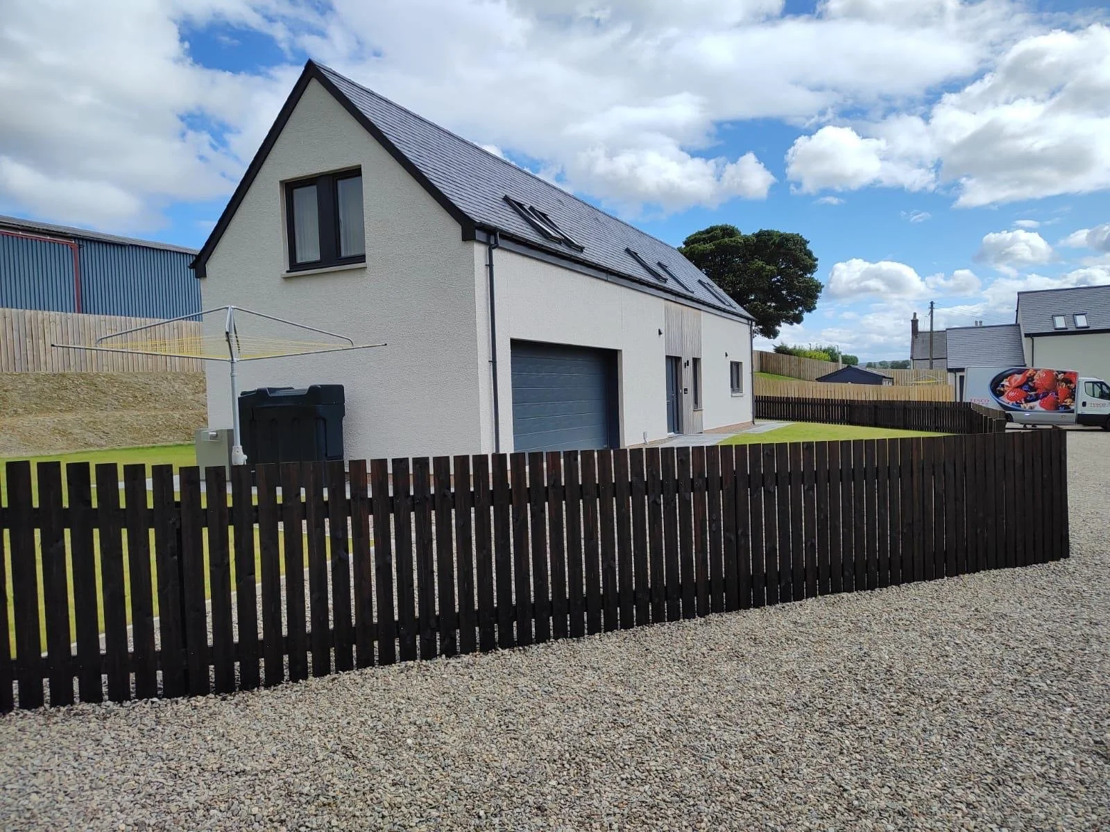 Modern white house with a black roof, brown fence, gravel driveway, and a truck with fruit branding parked nearby under a partly cloudy sky.