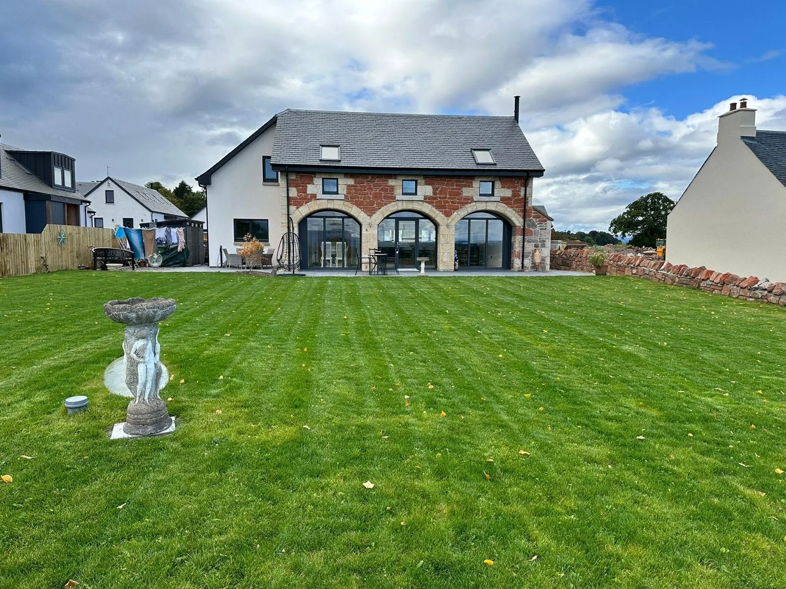 Backyard with well-maintained green lawn, stone birdbath, and modern house with large arched windows and stone facade. Other houses and trees are visible in the background.