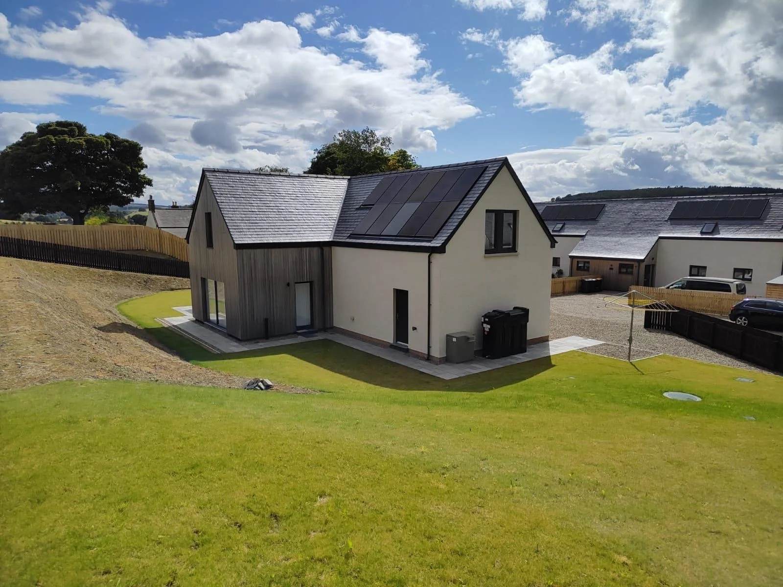 A modern house with a white facade, stone accents, and a black roof, surrounded by a wooden fence, with gravel driveway and nearby storage building under a partly cloudy sky.