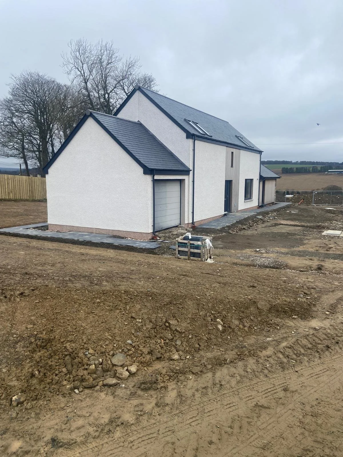 Newly constructed white house with dark gray roof and attached garage, situated in a rural area with bare trees and cloudy sky.