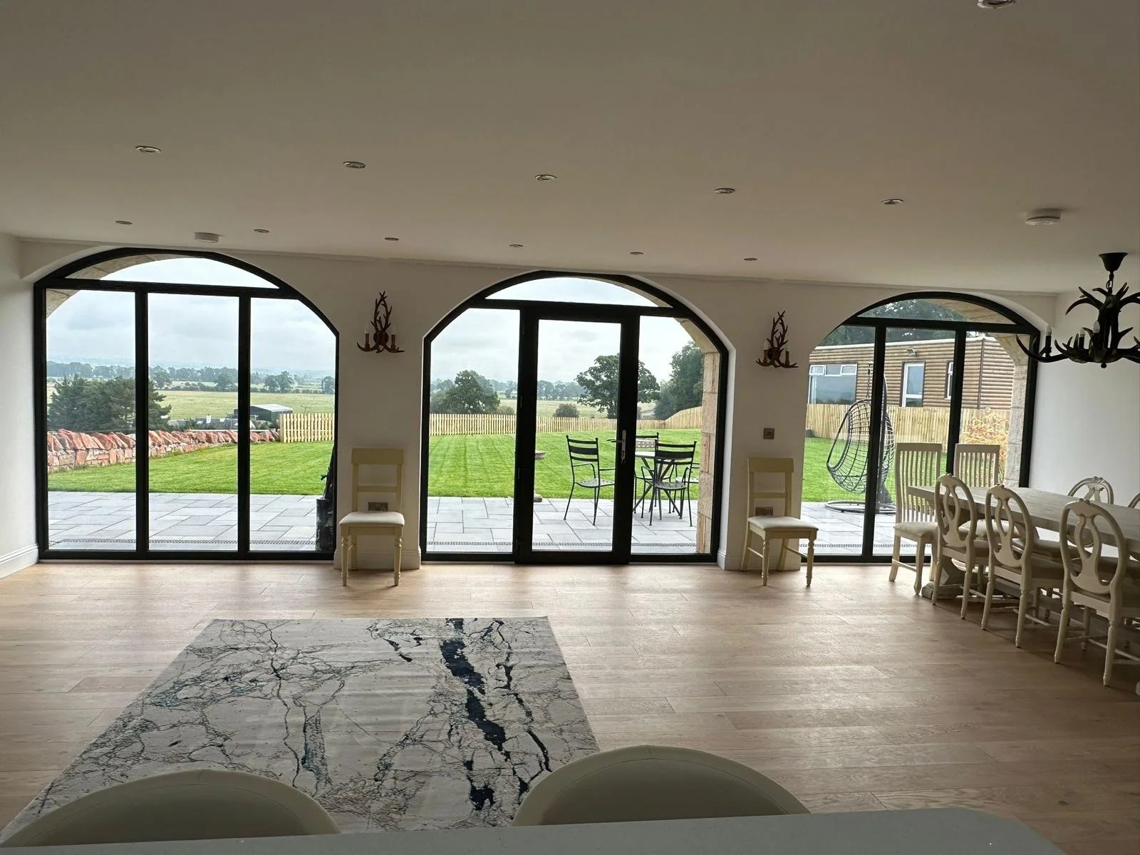 A spacious room with large arched glass sliding doors leading to a patio and green garden outside. The room features a dining table with chairs on the right and a marble rug on the wooden floor. There are also chairs indented against the wall and an