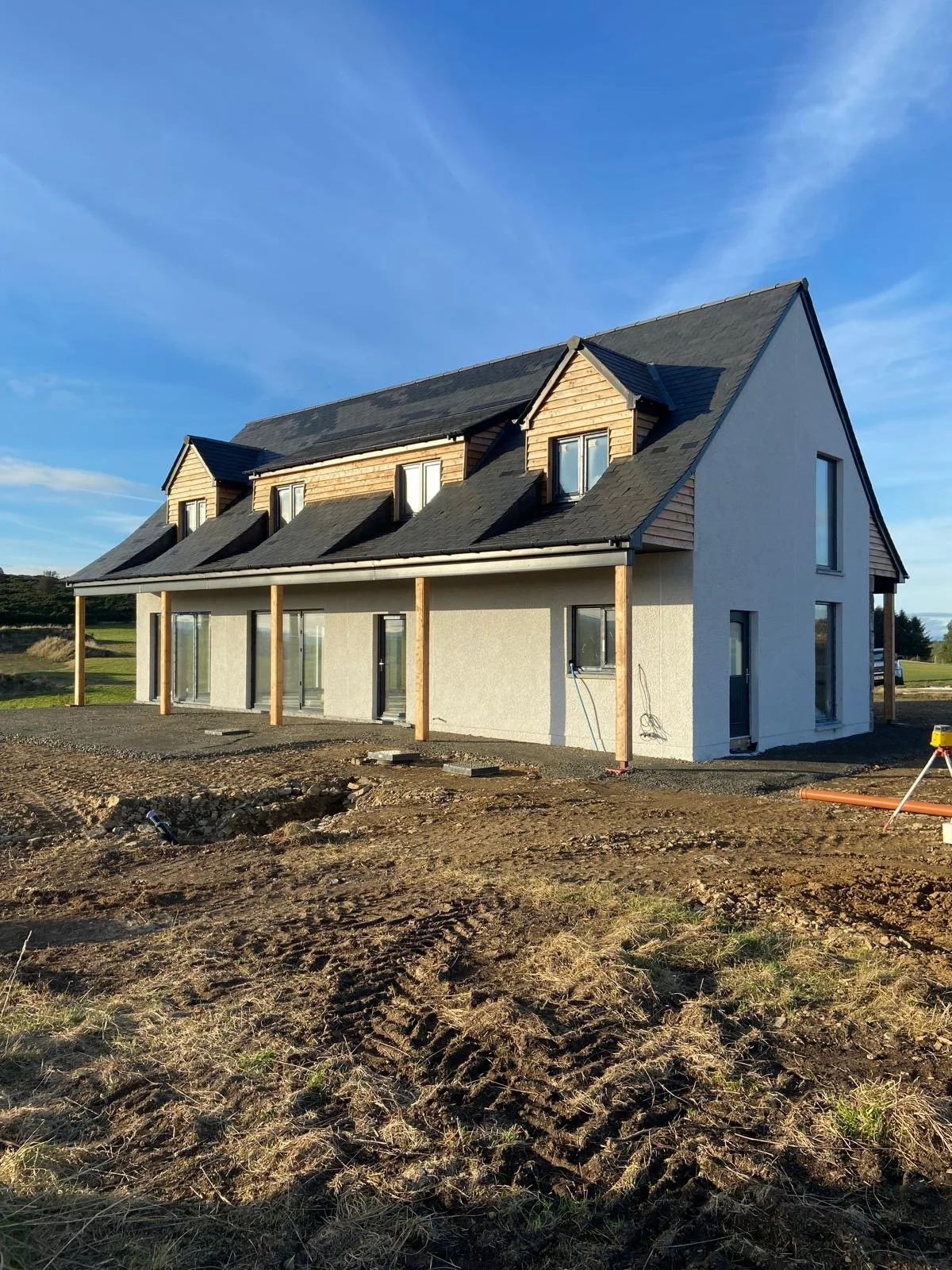 A modern two-story house under construction, featuring a combination of white stucco, stone, and wooden siding, with a dark gray roof, several windows, and a front entrance supported by two wooden posts, surrounded by dirt and construction materials.