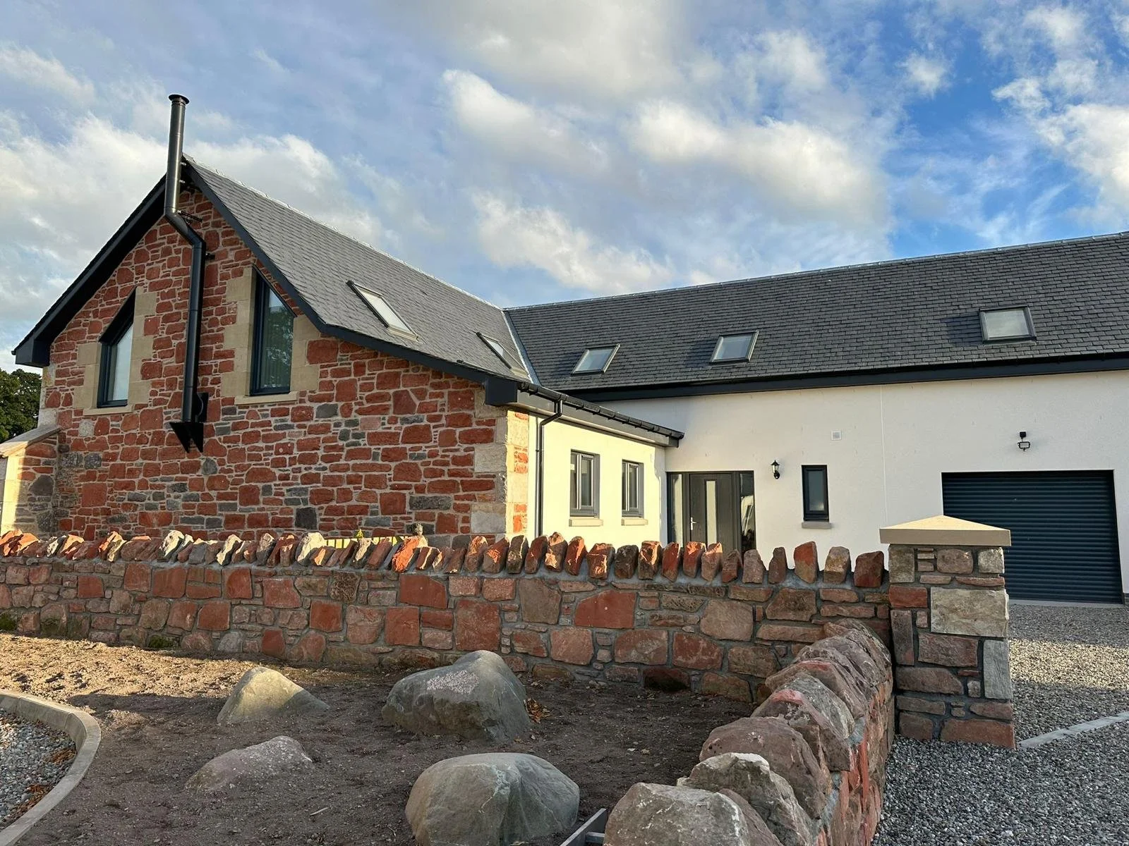 Exterior view of a modern house with a stone and white wall, black roof, and a stone fence with rocks and soil in the foreground under a cloudy sky.